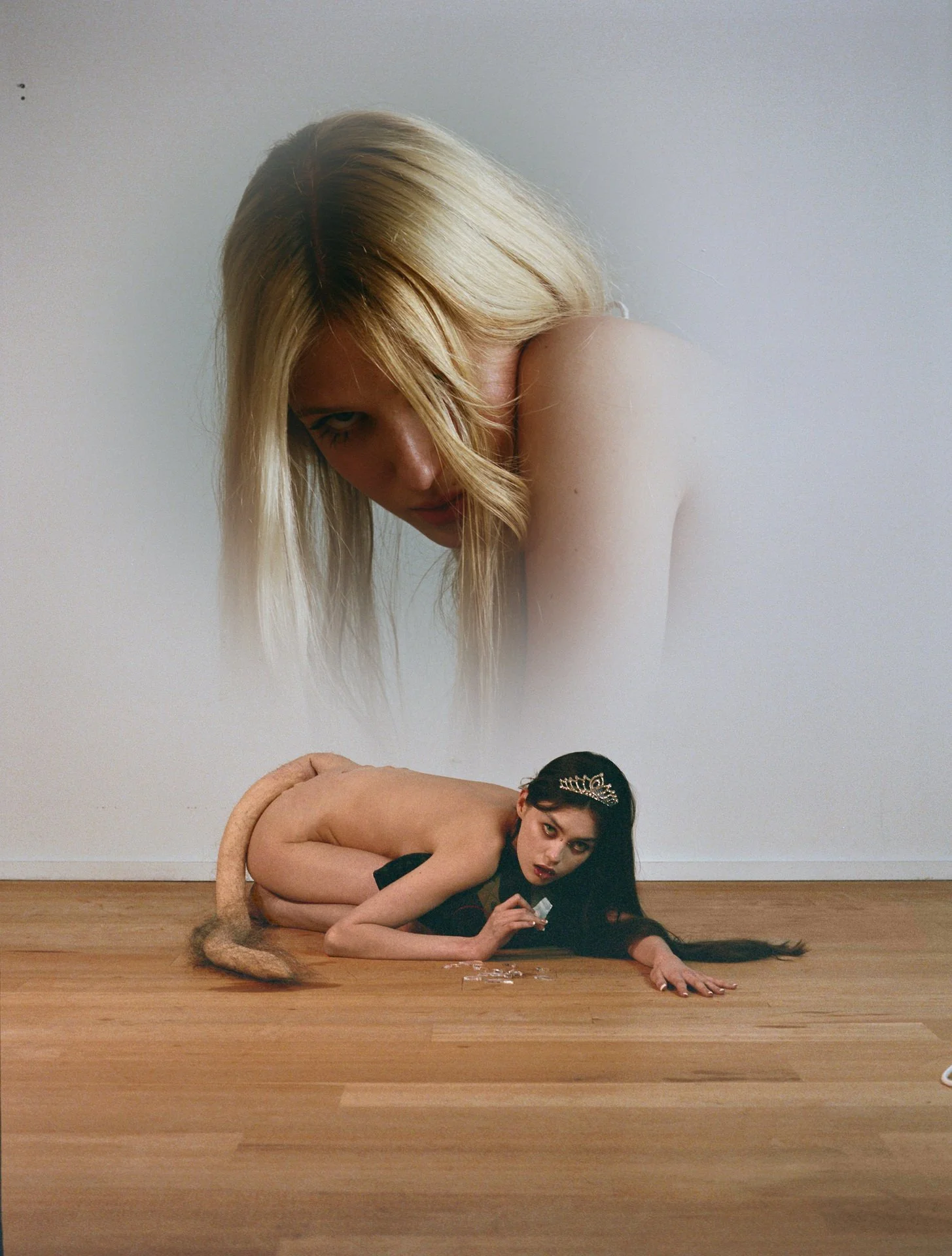 She shows me an image of a tiny dog, with a pink collar, being grasped by a scary human hand painted in black with long and sharp nails. I really like this one, because it was super off the cuff. I loved capturing the energy of this very innocent young dog which happened to be on this other shoot. It was a between shots pic but aesthetically it conveys this idea of surrendering something inherently innocent, a live animal incapable of judgment, to a narcissistic and evil embodiment of humanity. In the moment, there wasn’t that much deepness but when looking back at it, I saw all those aspects that spoke to me.